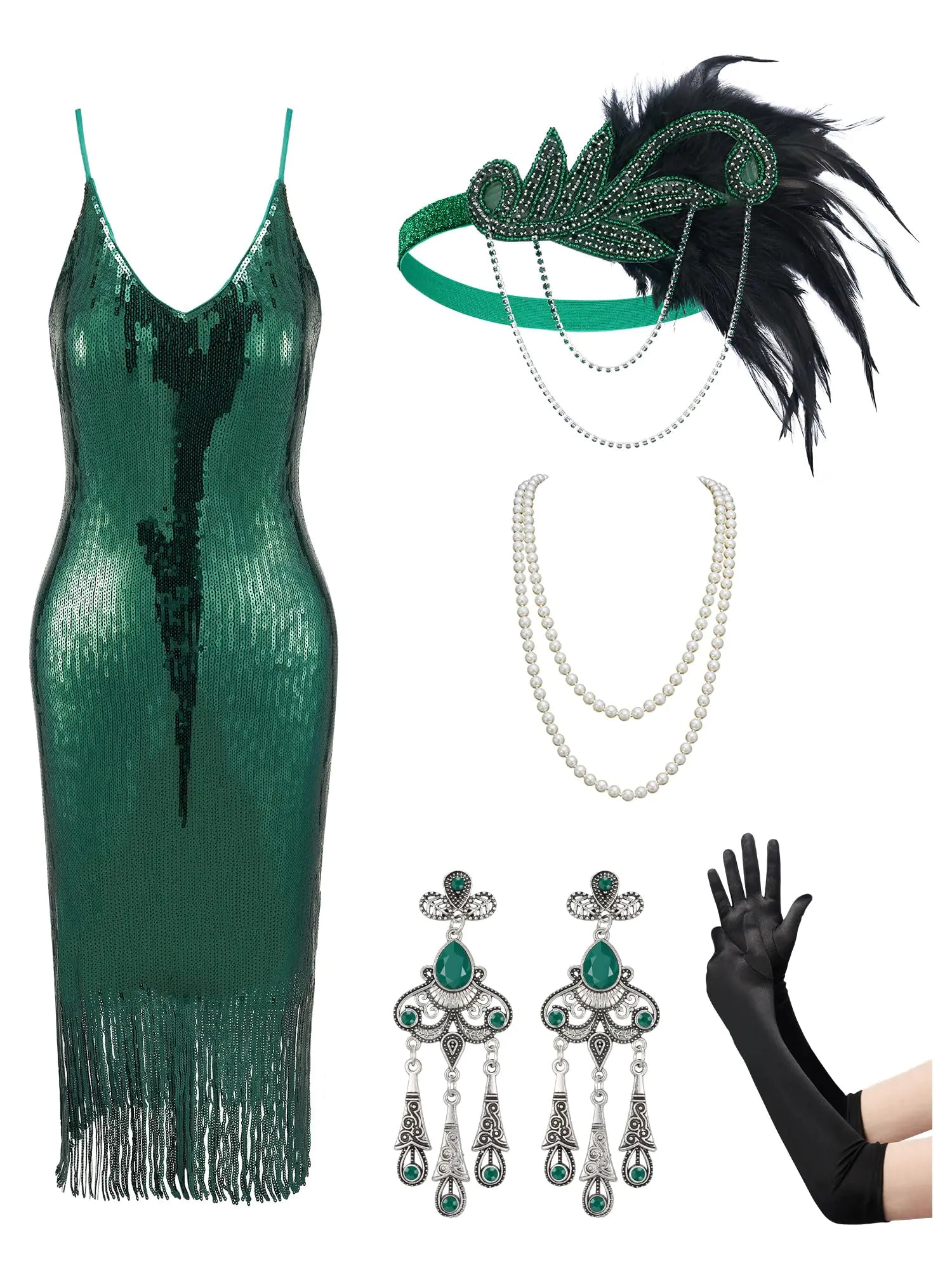 YESSA Flapper Dresses 1920s Gatsby Dresses for Women Roaring 20s Costumes Great Gatsby Outfits with 20s Accessories Set Malachite Green Small